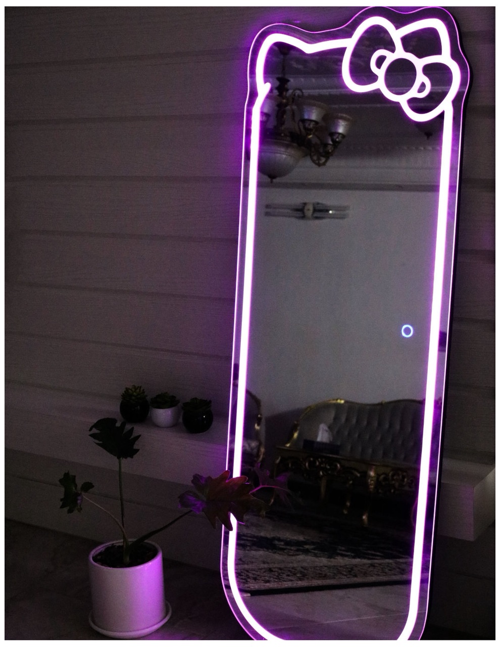 آینه Back Light مدل Kitty Mirror قدی تلفیقی از نور و آینه با طرح شخصیت کیتی میباشد و باعث میشود علاوه بر ویژگی آینه بودن محصول به عنوان روشنایی در محل مورد نظر برای استفاده روزمره و میکاپ استفاده شود . بازتاب آینه به دلیل آبکاری خوب از کیفیت بسیار بالایی برخوردار است. ولتاژ ورودی برق مورد استفاده در این بک لایت 220 ولت است که به شما این امکان را میدهد بدون نیاز به مبدل مستقیما به برق شهری متصل نمایید. از دیگر ویژگی های این محصول قابلیت خاموش و روشن کردن نور آینه به دو صورت کلید لمسی و کلید مکانیکی است که کلید لمسی بر روی آینه قرار گرفته شده است. در آینه های کیتی تک رنگ با استفاده از کلید لمسی میتوان آینه را روشن و خاموش کرد و در آینه های کیتی چند رنگ (multi color) با استفاده از کلید لمسی علاوه بر روشن و خاموش کردن نور آینه، رنگ نور آینه را نیز میتوان تغییر داد و به رنگ دلخواه خود از میان طیف رنگهای گوناگون تغییر داد.