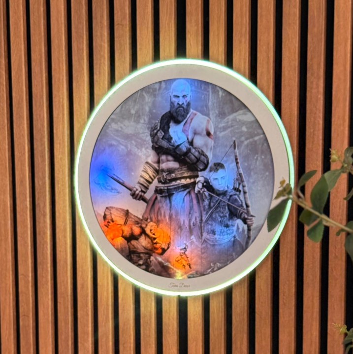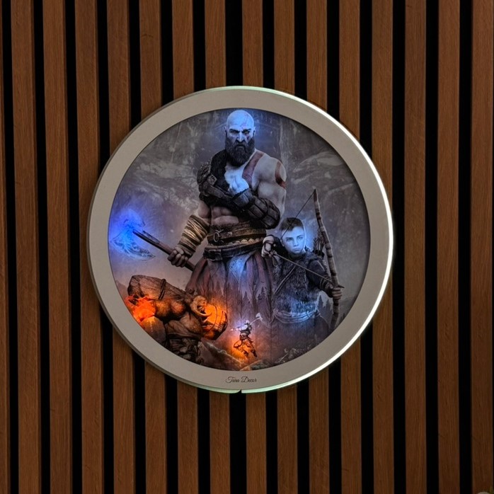 تابلو نوری گرد مدل بازی God of war با قطر ۴۵ سانتیمتر، دارای نور LED داخلی و ریسه نئون دورتادور قاب.