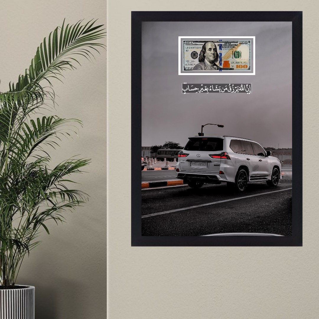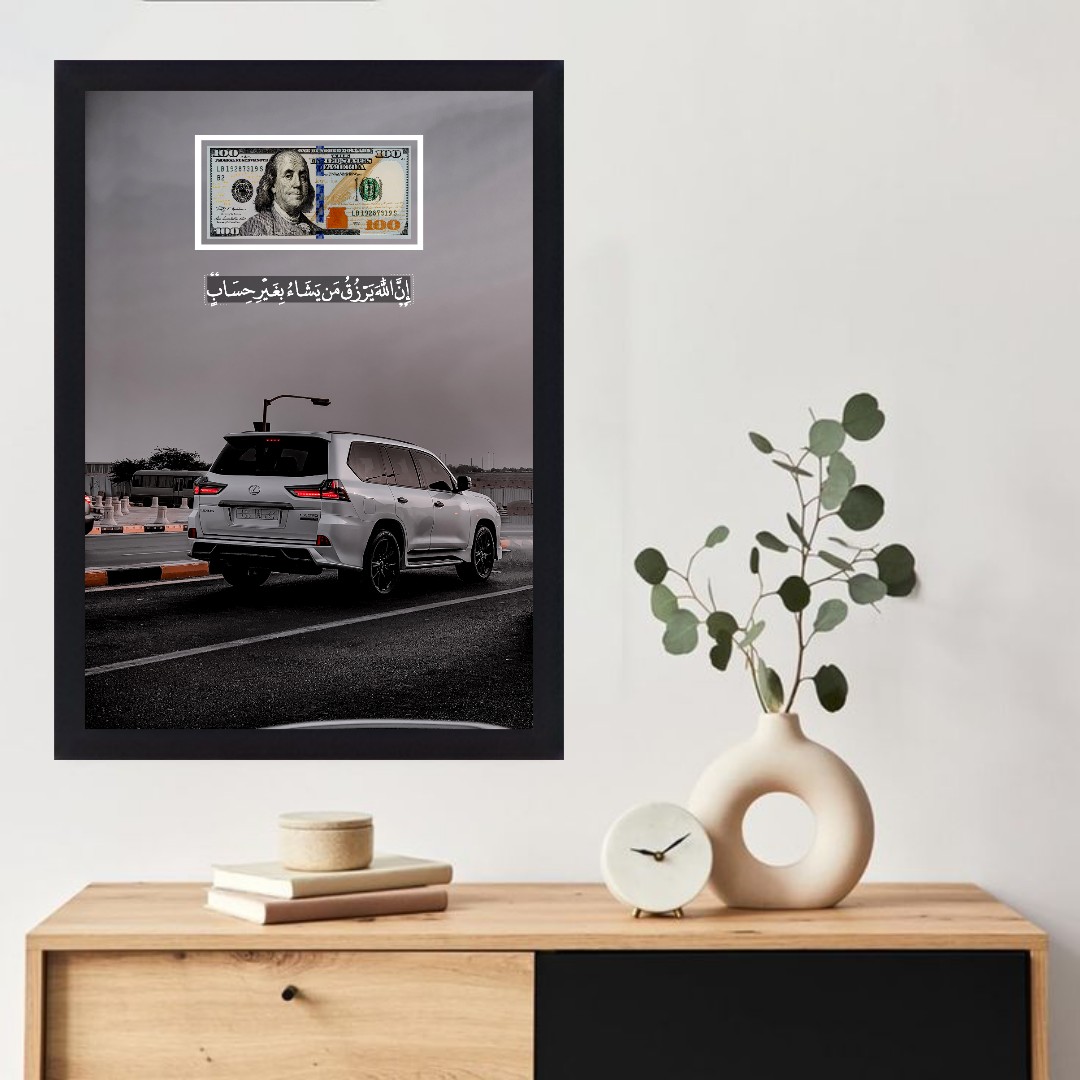 تابلو بکلایت آیه رزق | ماشین لکسوس و دلار