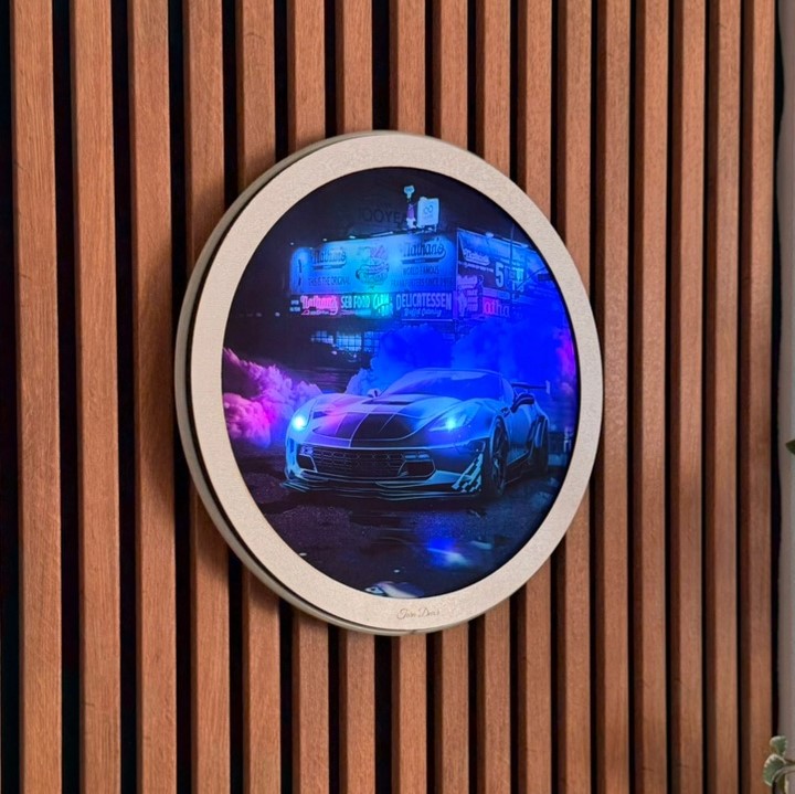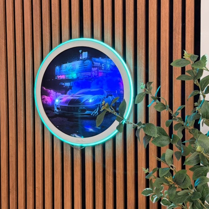 تابلو نوری گرد با قطر ۴۵ سانتیمتر، دارای نور LED داخلی و ریسه نئون دورتادور قاب.