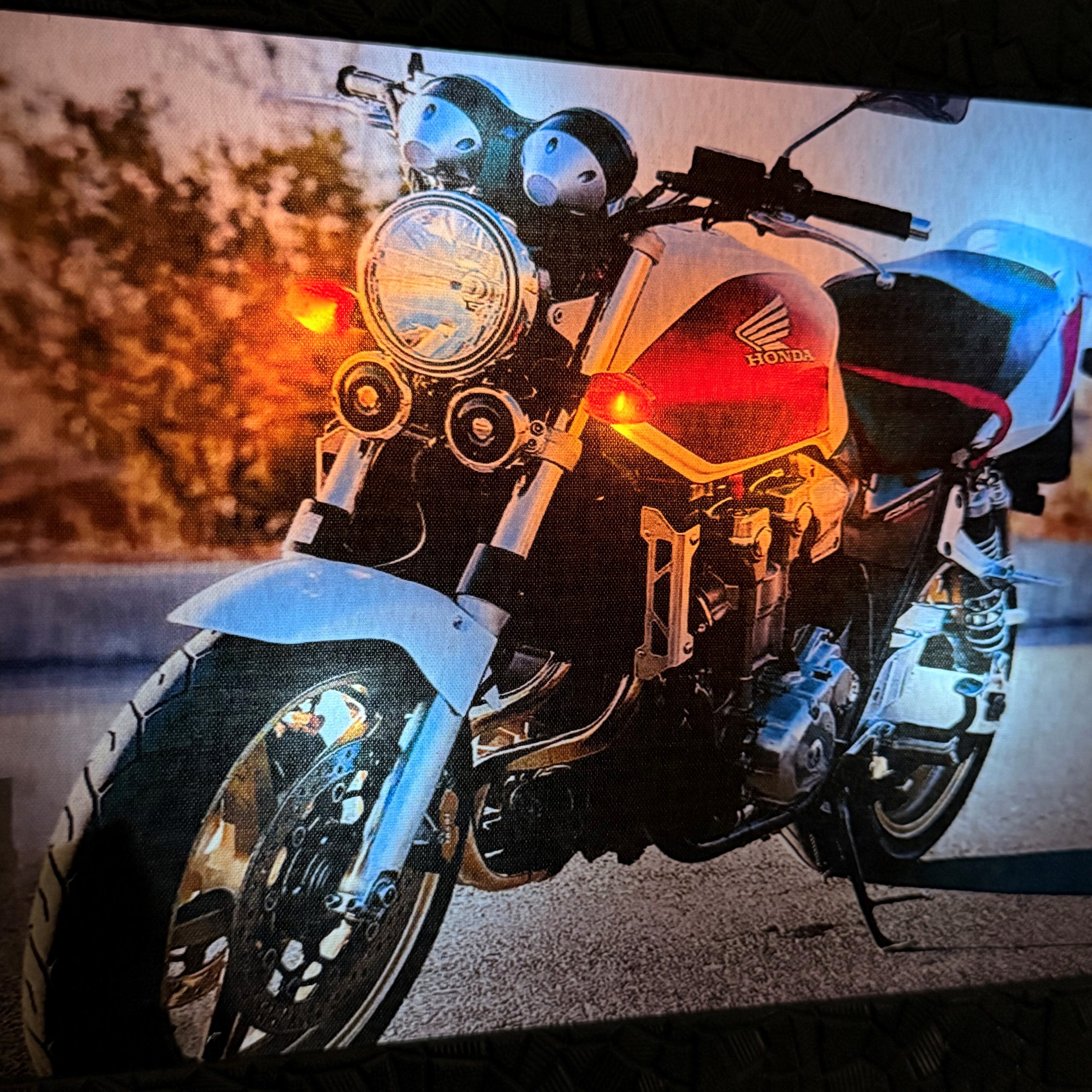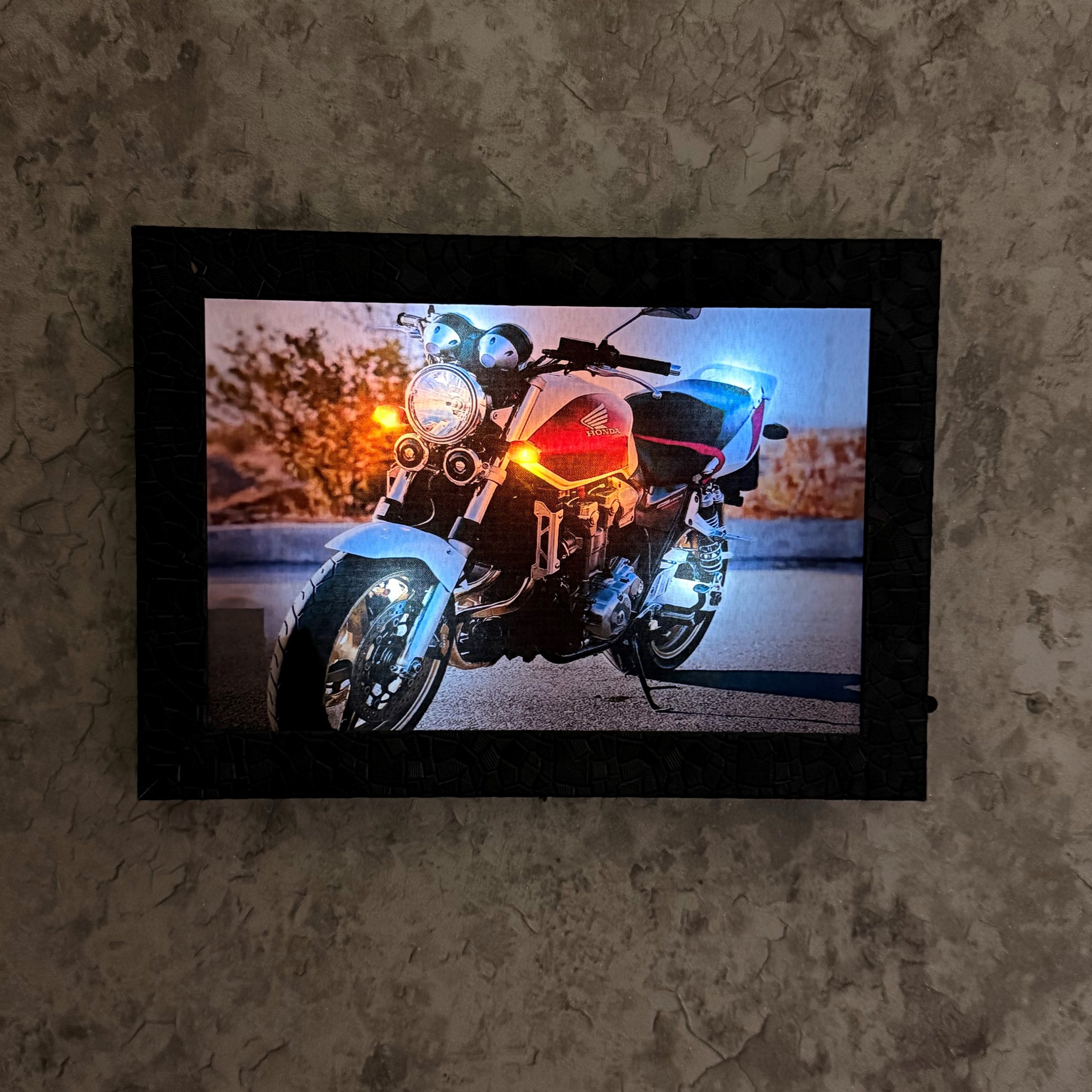 تابلو نوری طرح موتور سنگین Honda CB1300، یک دکوری خاص و جذاب برای علاقهمندان به موتورسیکلت و سبک صنعتی است. این تابلو با نور LED داخلی، جلوهای زنده و واقعی به تصویر میدهد و میتواند نقطهی تمرکز دیوار هر فضا باشد.
