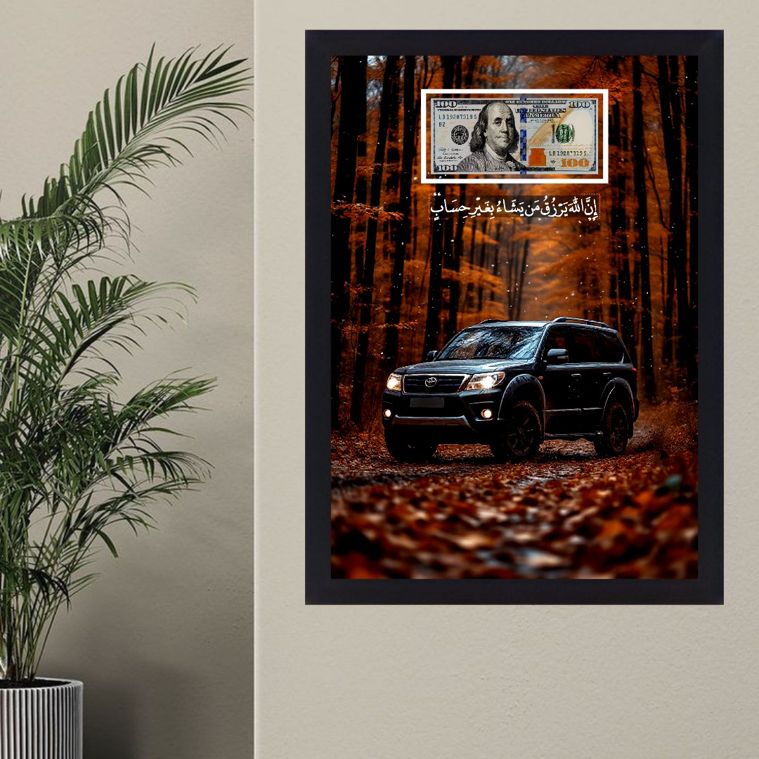 تابلو بکلایت آیه رزق- دلار | تویوتا در جنگل پاییزی