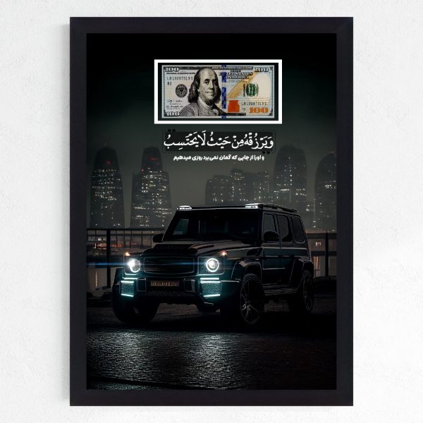 تابلو بکلایت آیه رزق | بنز G کلاس و اسکناس دلار